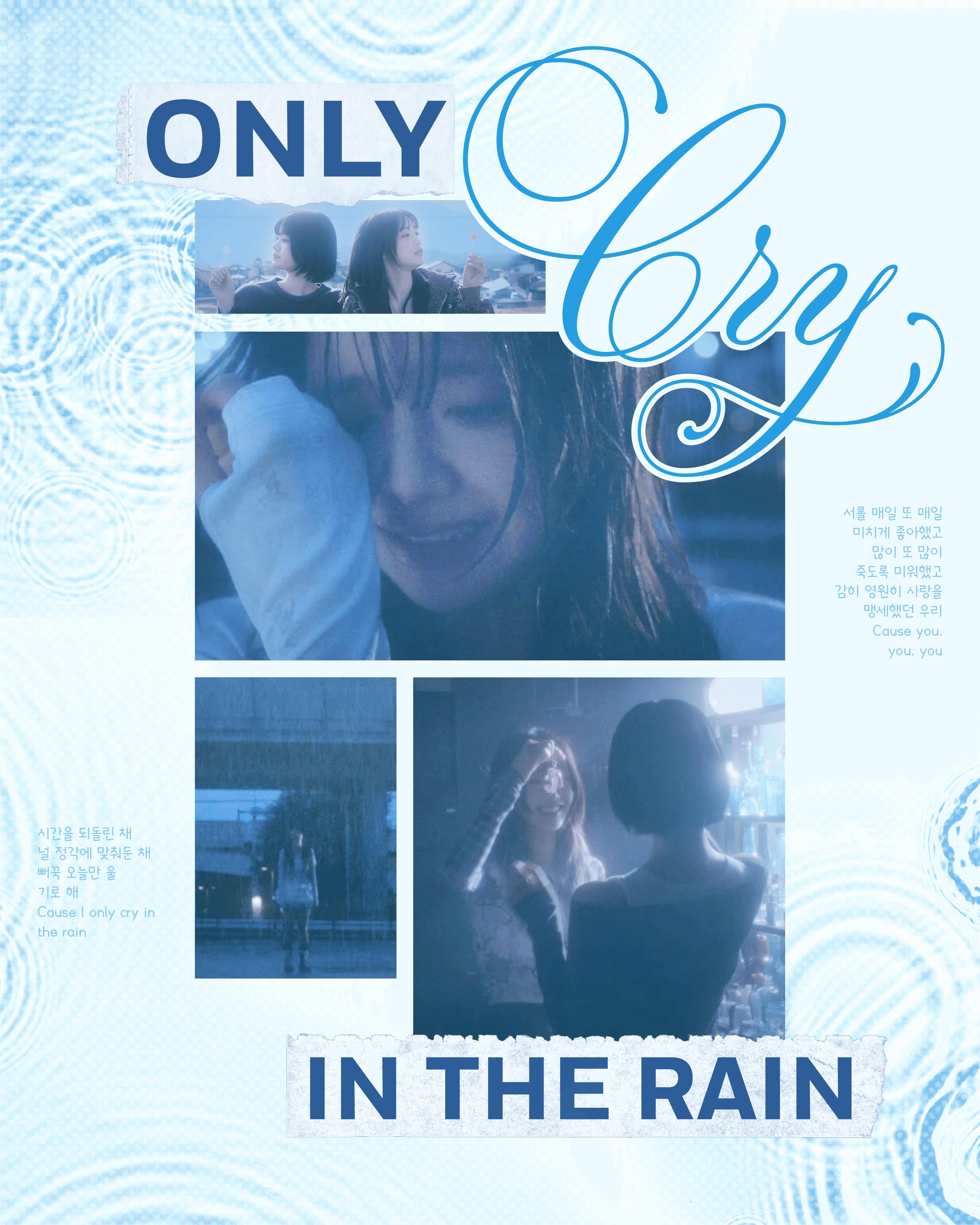 Chuu was a member in Loona, my favorite musical artist/group. Following her release of Only cry in the rain in April, I kept playing the song over and over. My love for the song and motivation to create led me to my objective—create a poster using visually harmonious typography, texture, and composition that conveys the wistful feeling I get when I listen to Only cry in the rain.