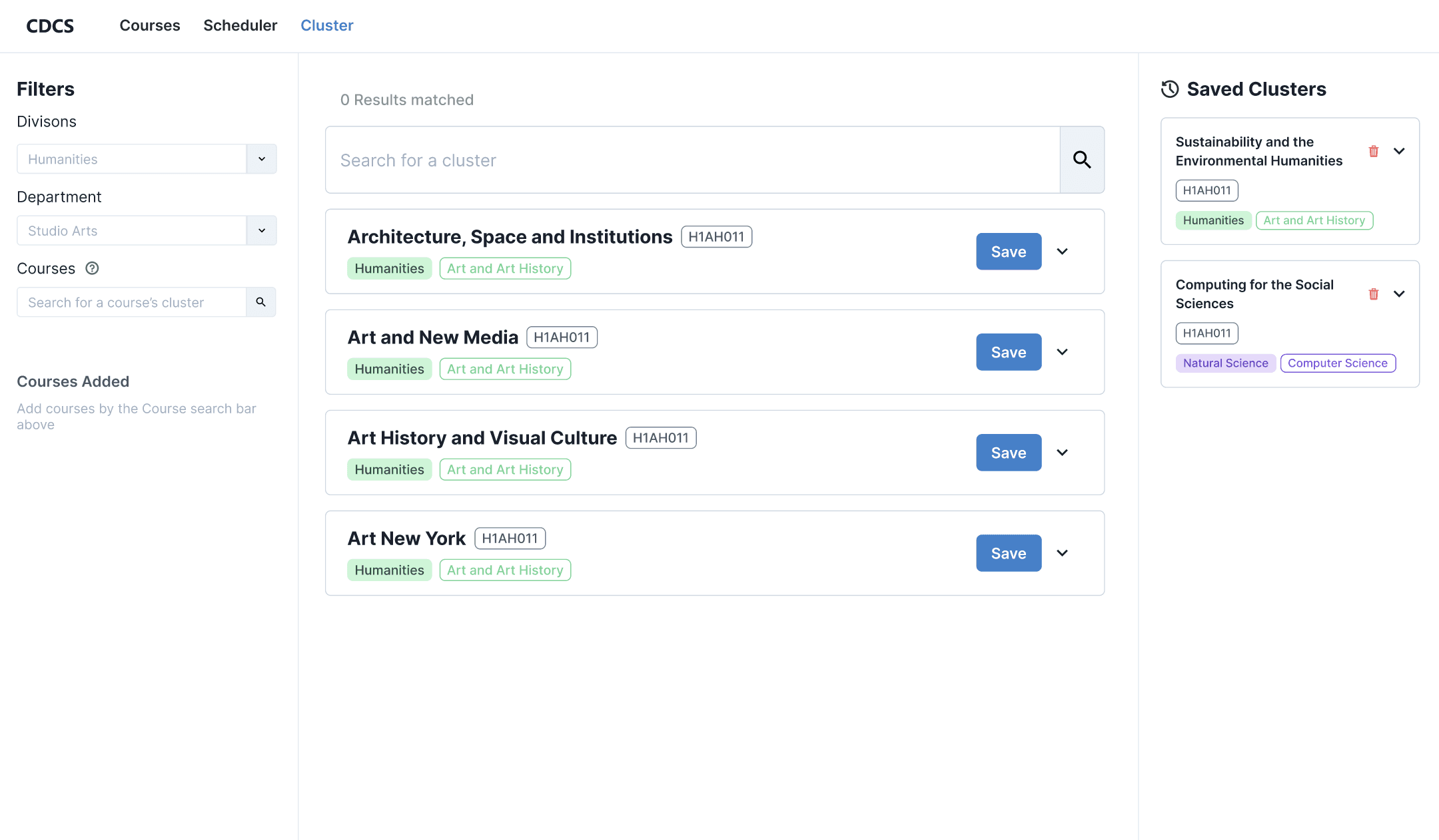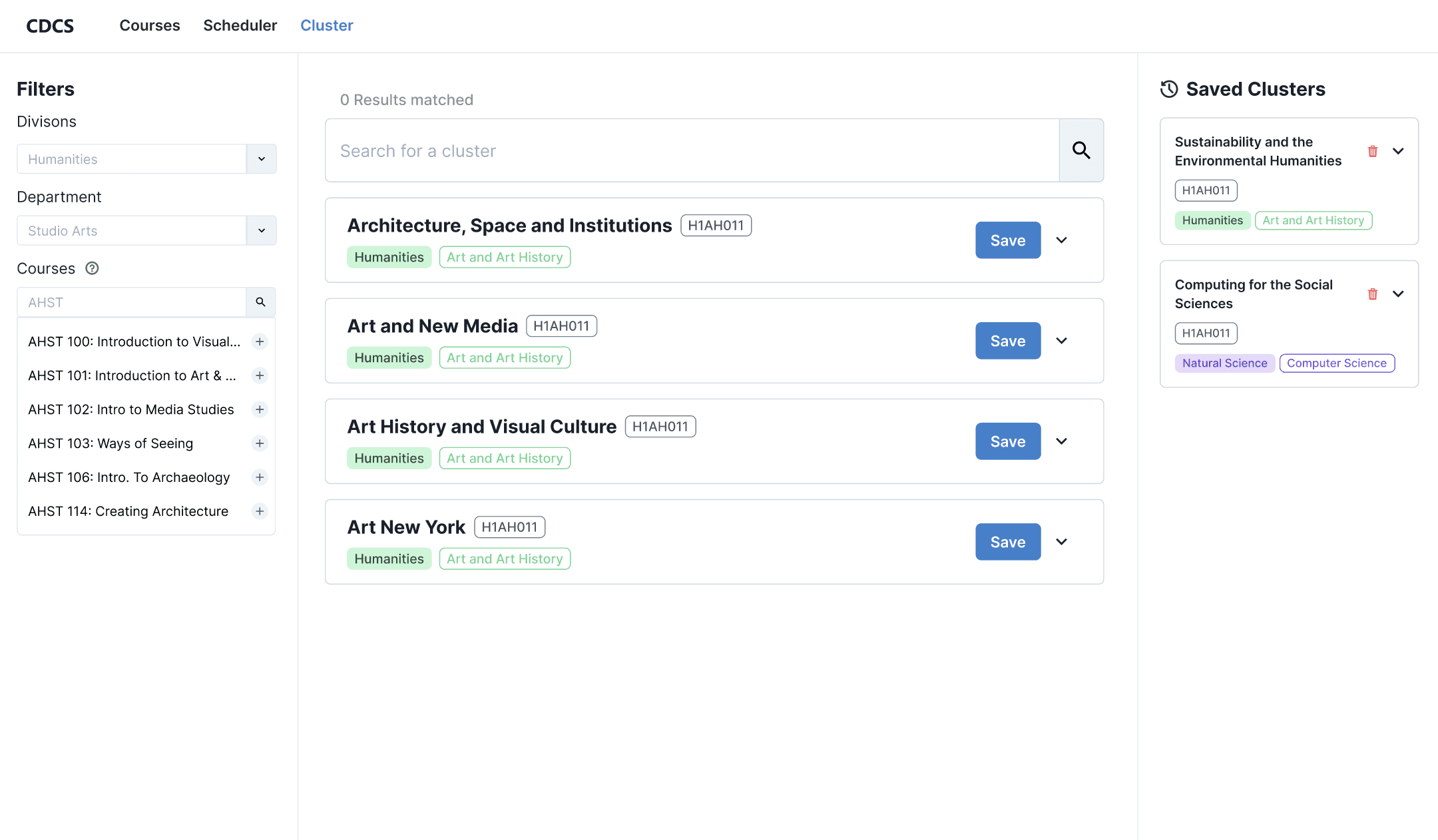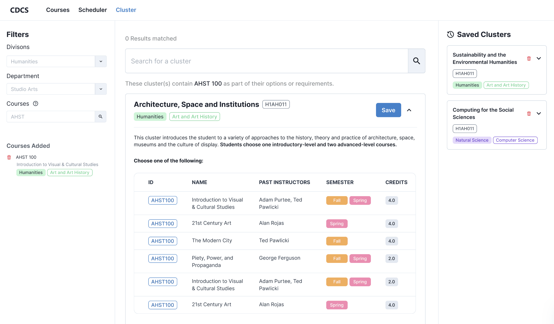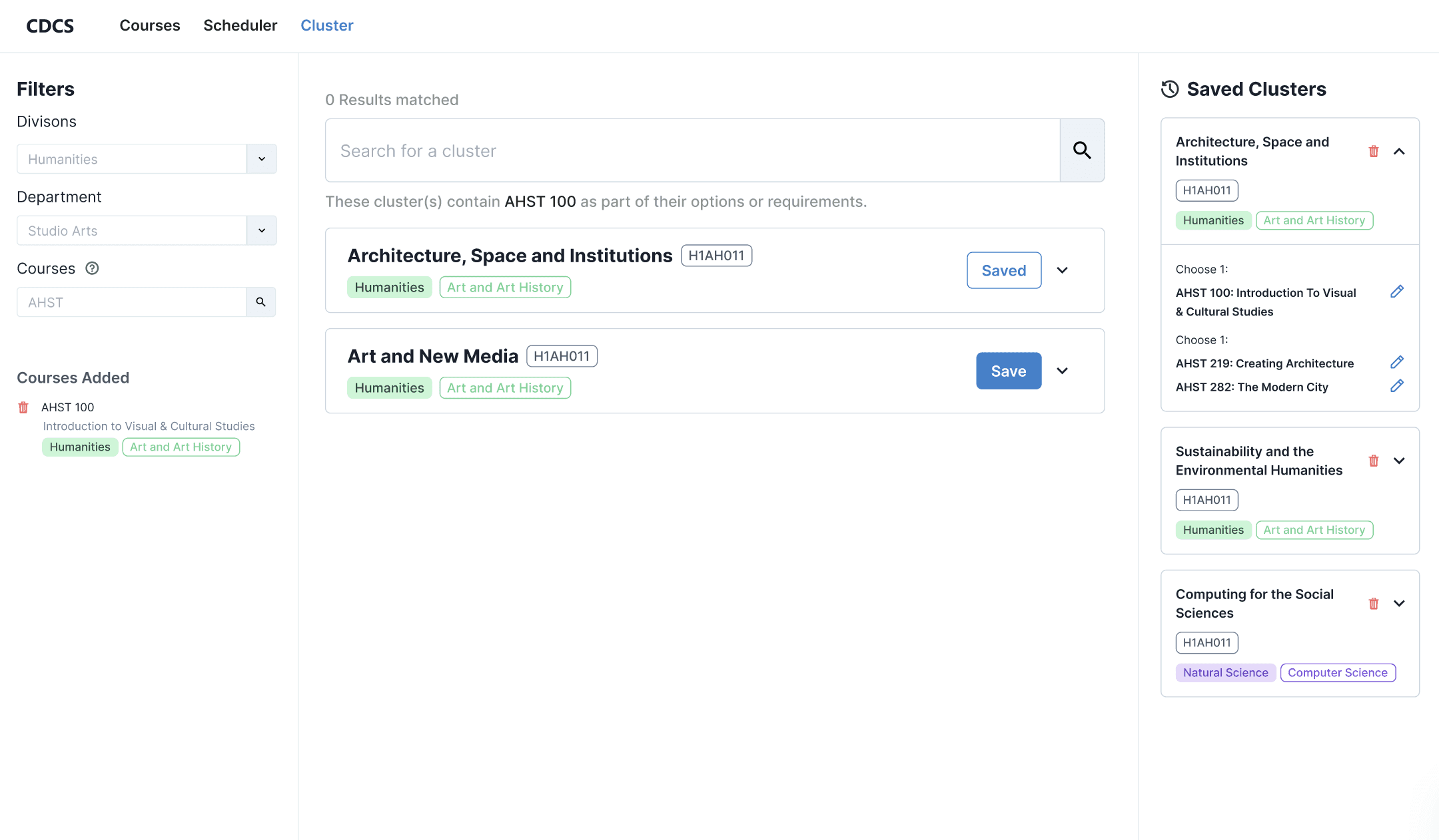 The next iteration, we scrapped the cluster guide section for a saved cluster feature. The cluster guide wouldn't be useful for users who knew how clusters worked, which would be the majority of users since the school makes it known that clusters are apart of a graduation requirement.