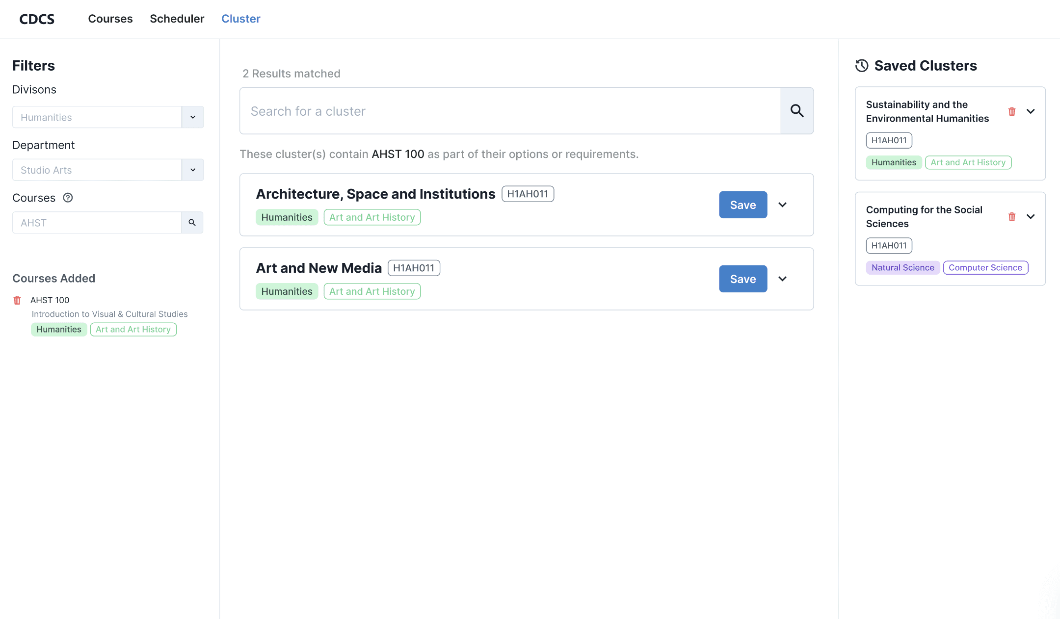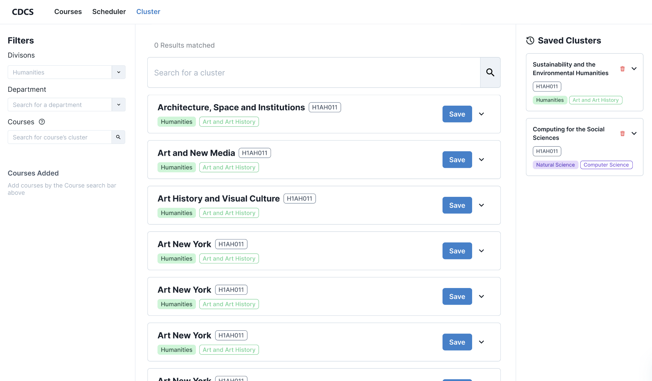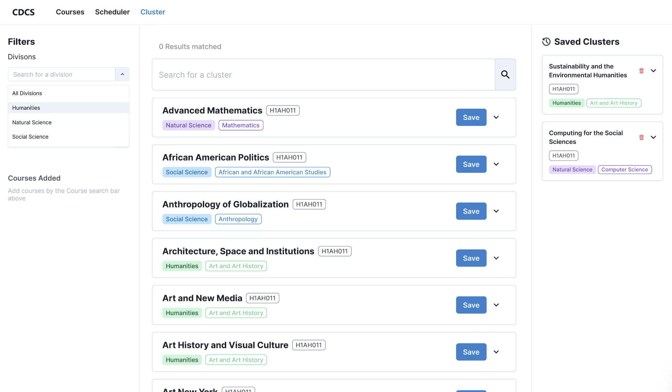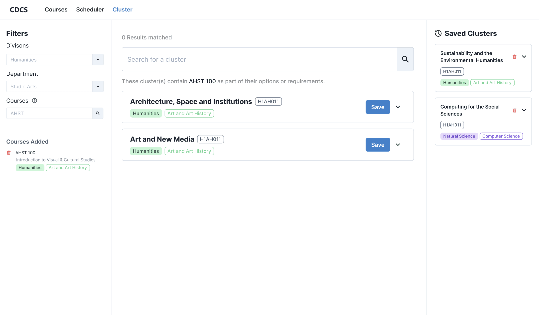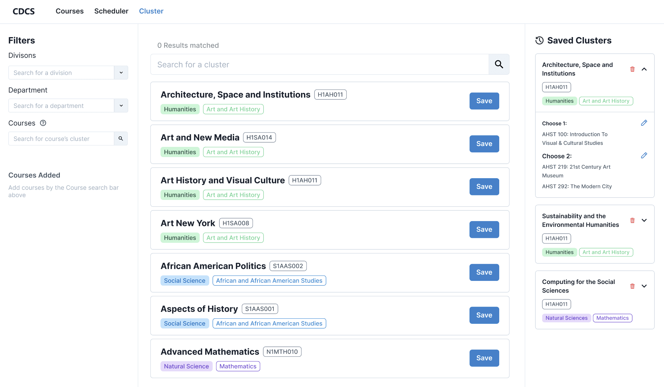 The next iteration, we scrapped the cluster guide section for a saved cluster feature. The cluster guide wouldn't be useful for users who knew how clusters worked, which would be the majority of users since the school makes it known that clusters are apart of a graduation requirement.