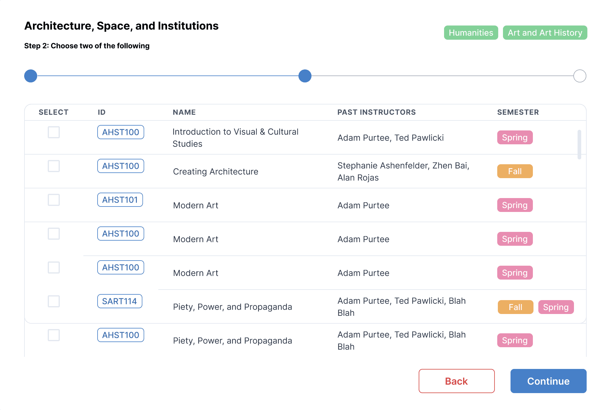 User moves to the next step and selects desired courses. For this section, the user must select 2 courses.