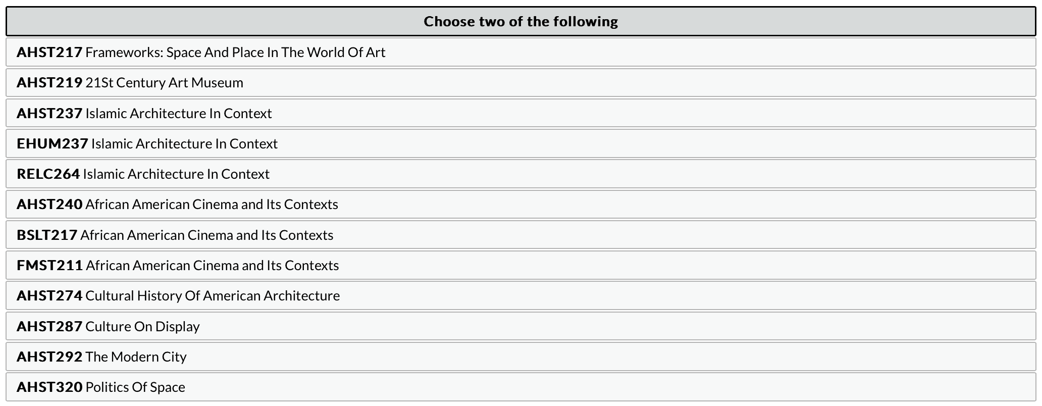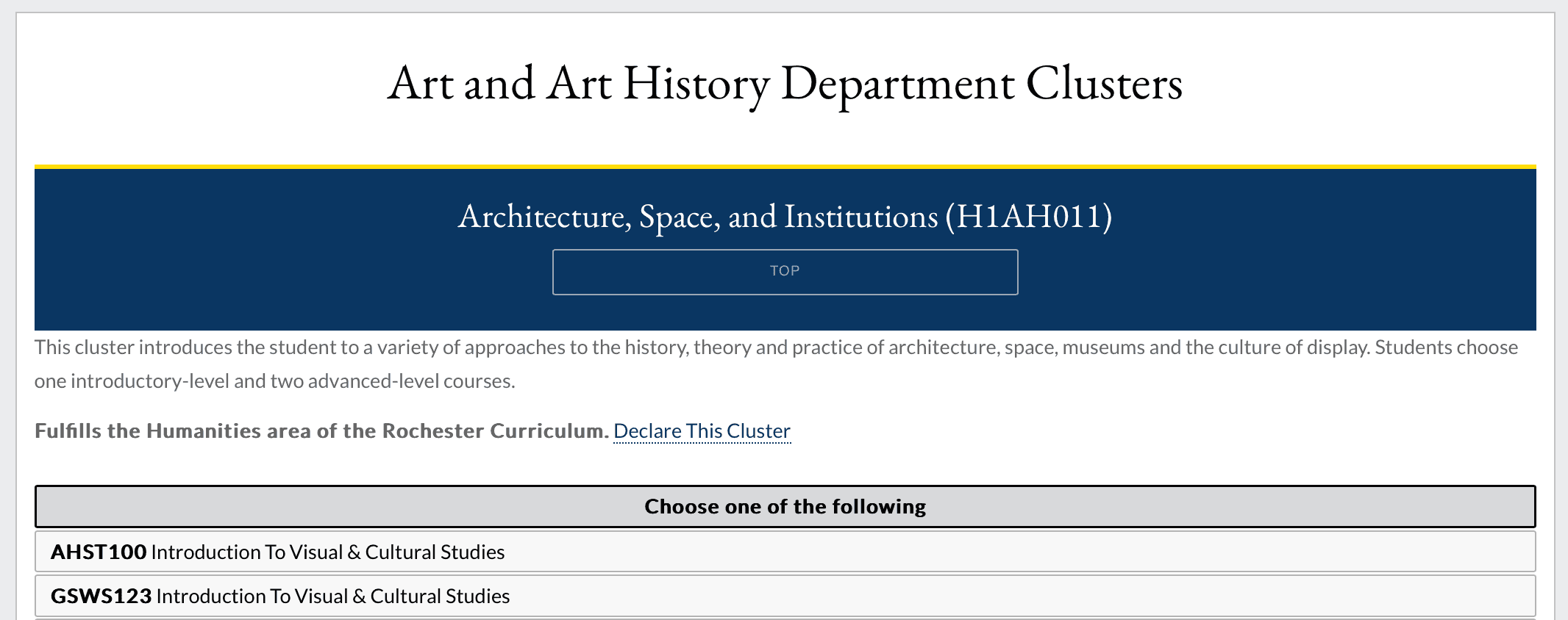 Only clusters in the humanities division, studio art department, AND include the AHST 100 course are shown.