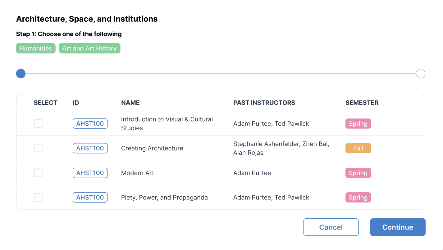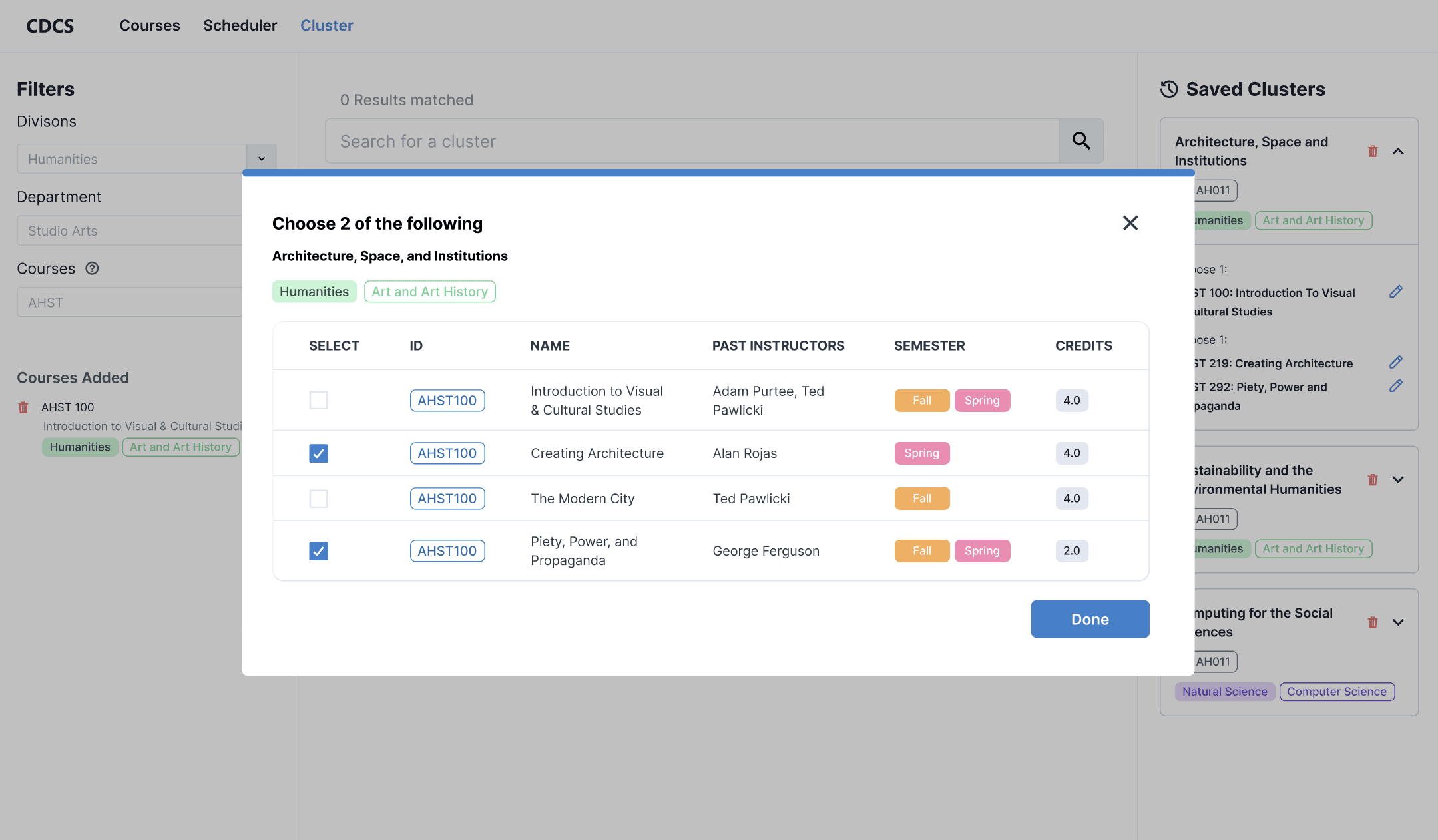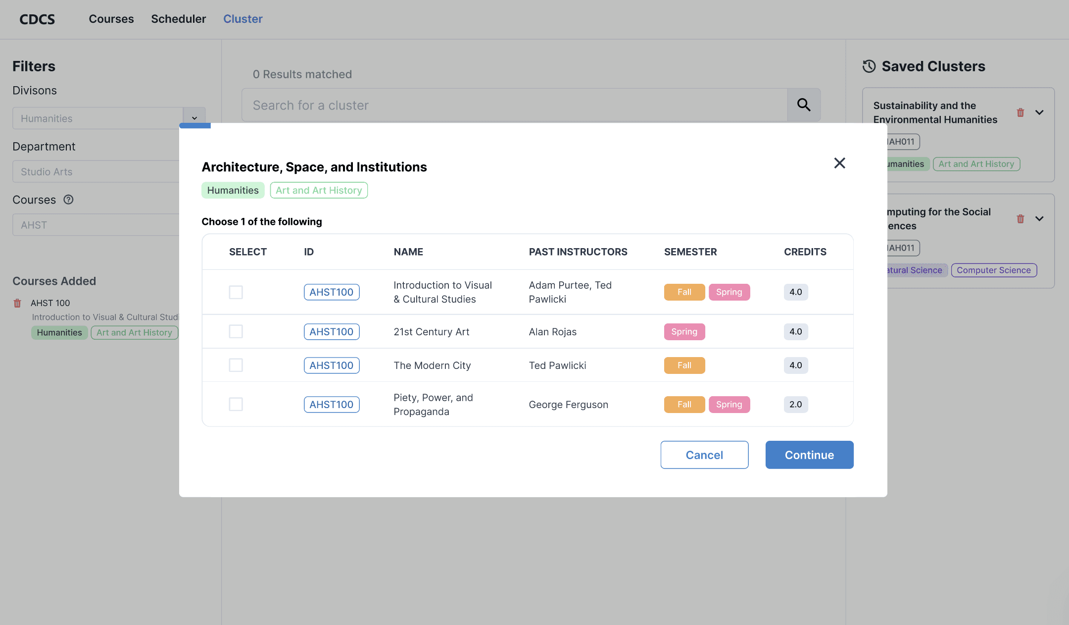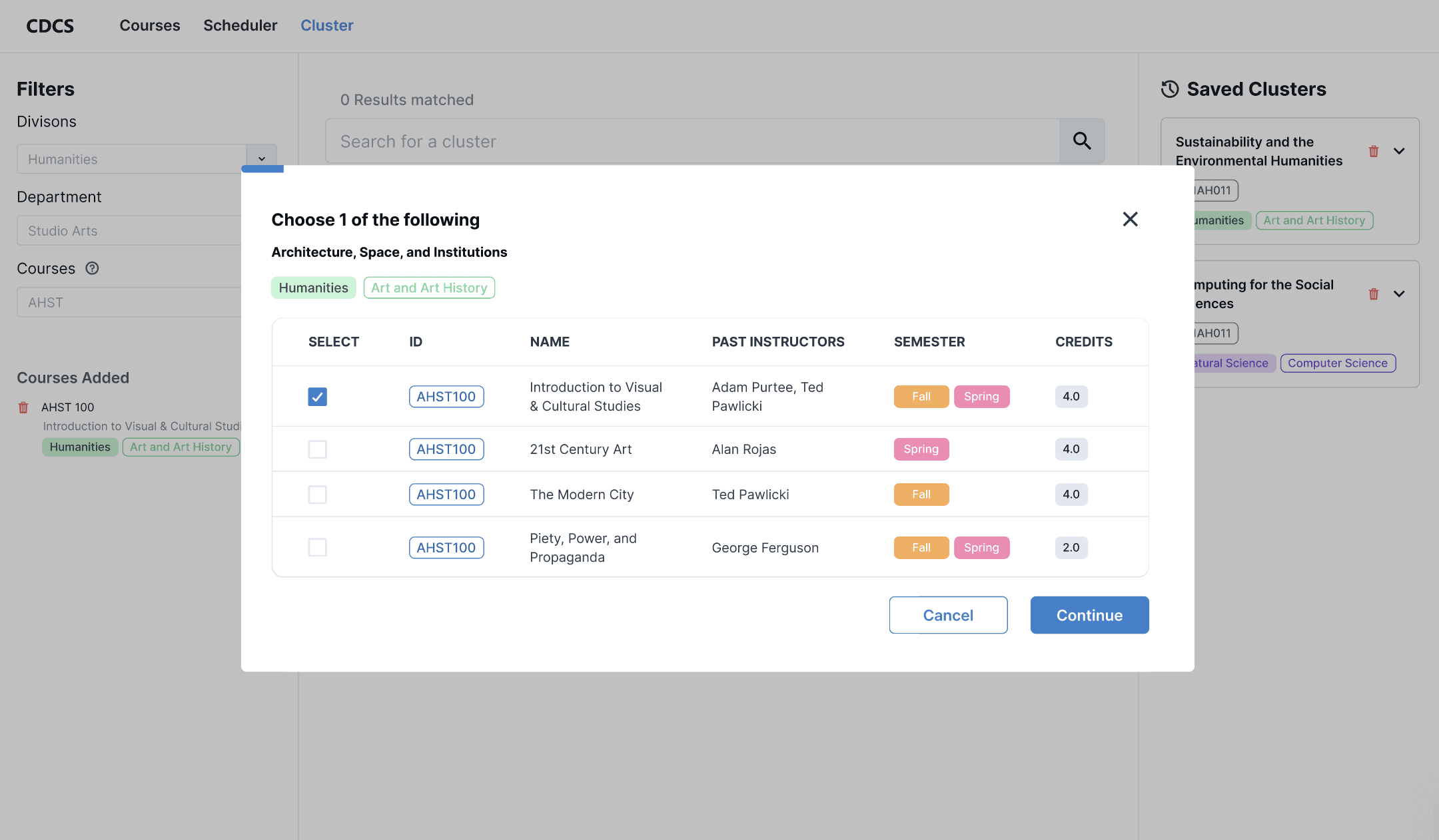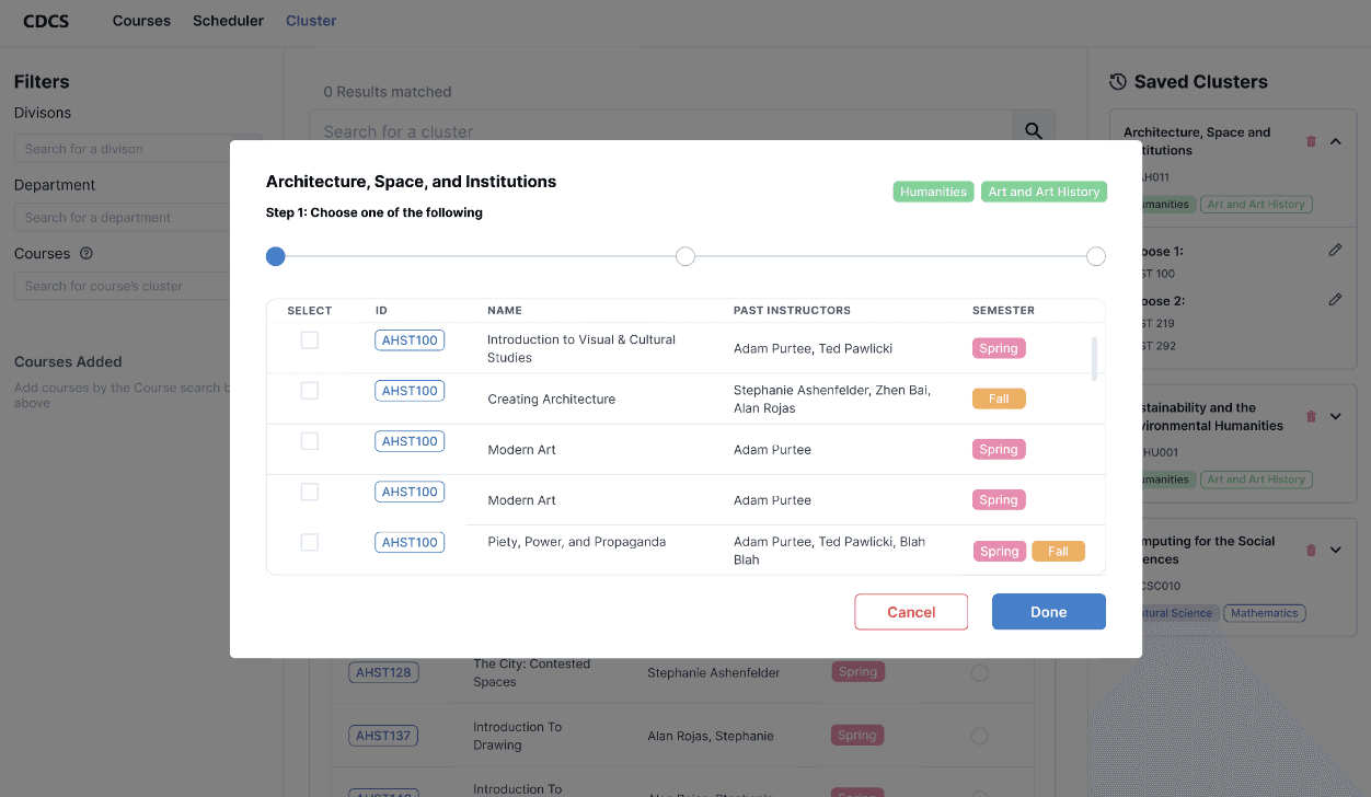 In addition, we were also playing with the idea of having a modal for the process of selecting the courses to take in a cluster.