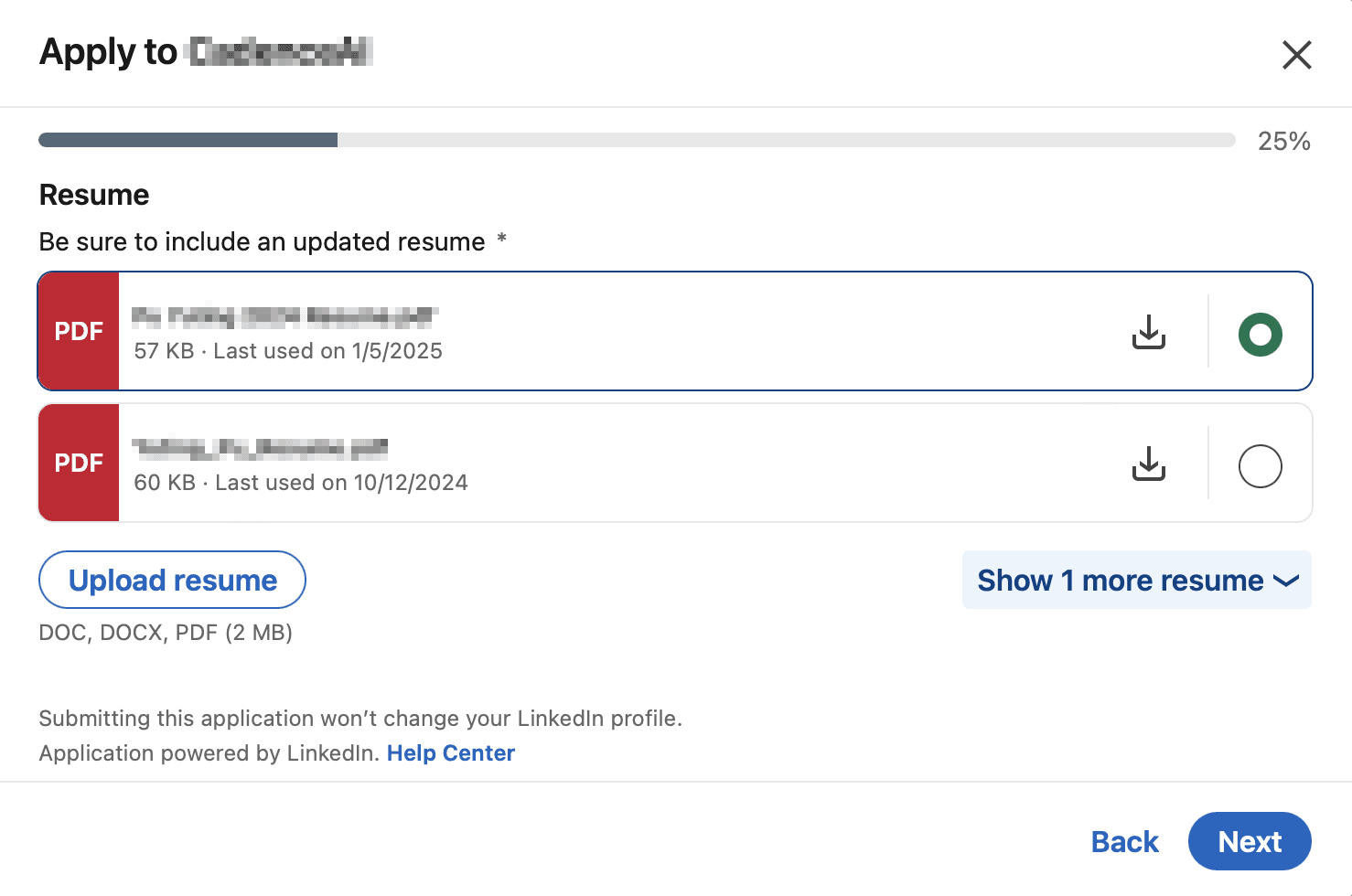 For the modal, we wanted to implement a better way for users to visualize their selection progress. We took inspiration from LinkedIn's easy apply modal.