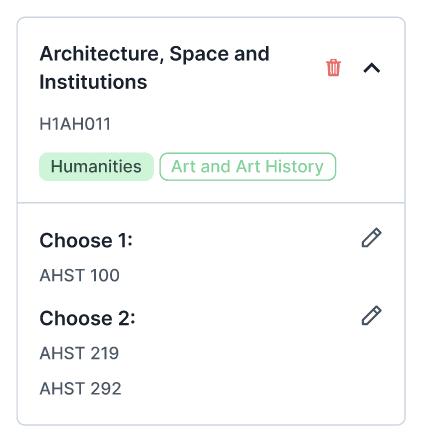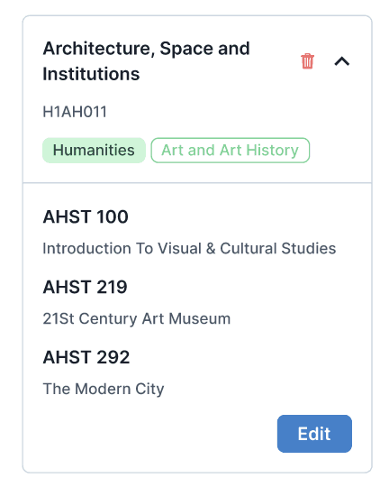 We only made minor changes to the information hierarchy of the saved cluster cards. We placed more emphasis on the course names and deprioritized the cluster choice sections ("Choose 1"). We also put edit buttons next to each course in a section so that users could precisely edit their saved clusters.
