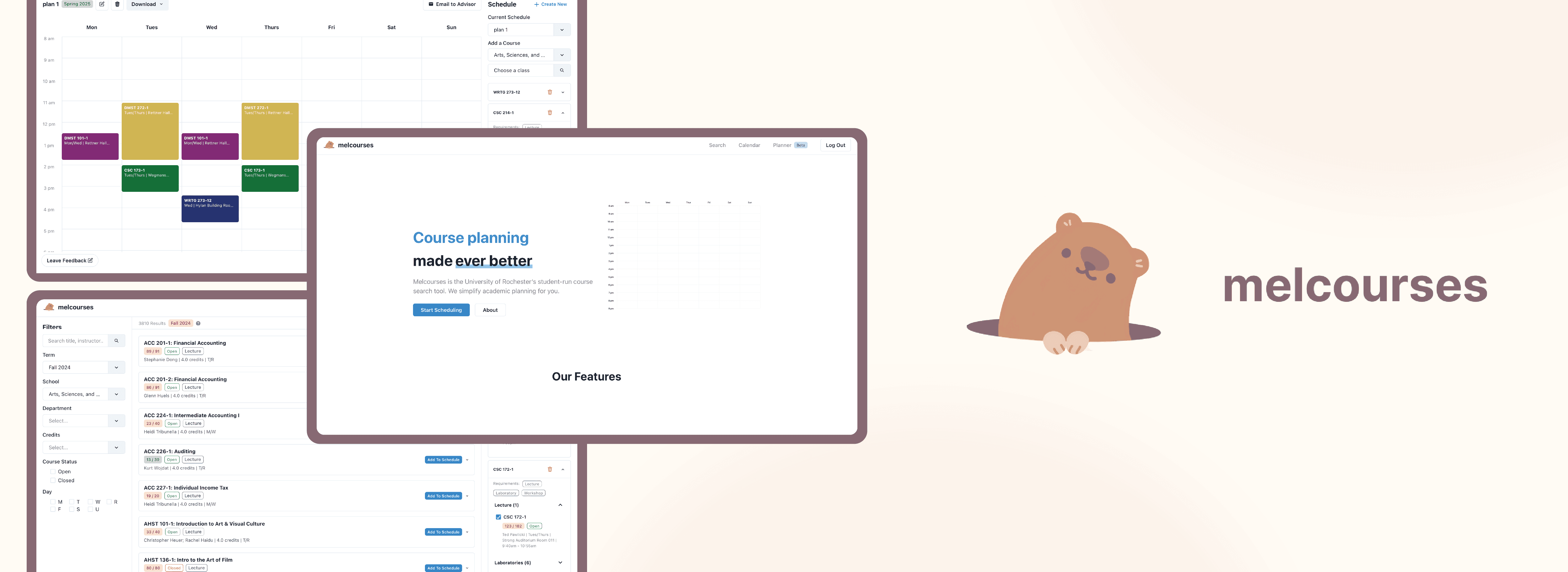 Melcourses is an unofficial course planning website to help University of Rochester students plan their upcoming semester schedules. The Melcourses UI/UX team is made of 4 designers and we work on maintaining the UI and implementing new features to our live website. To implement our designs, we work with a team of 6 developers.