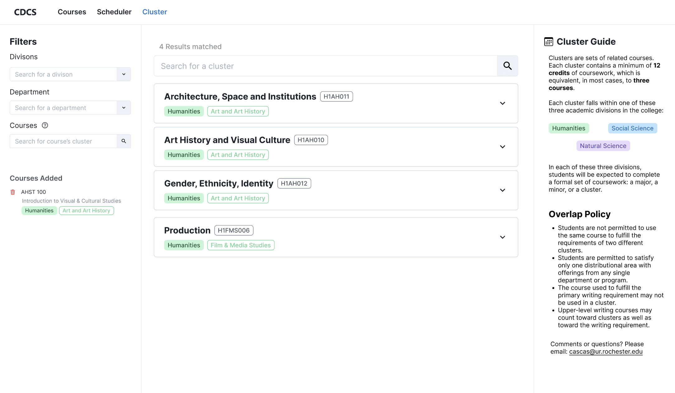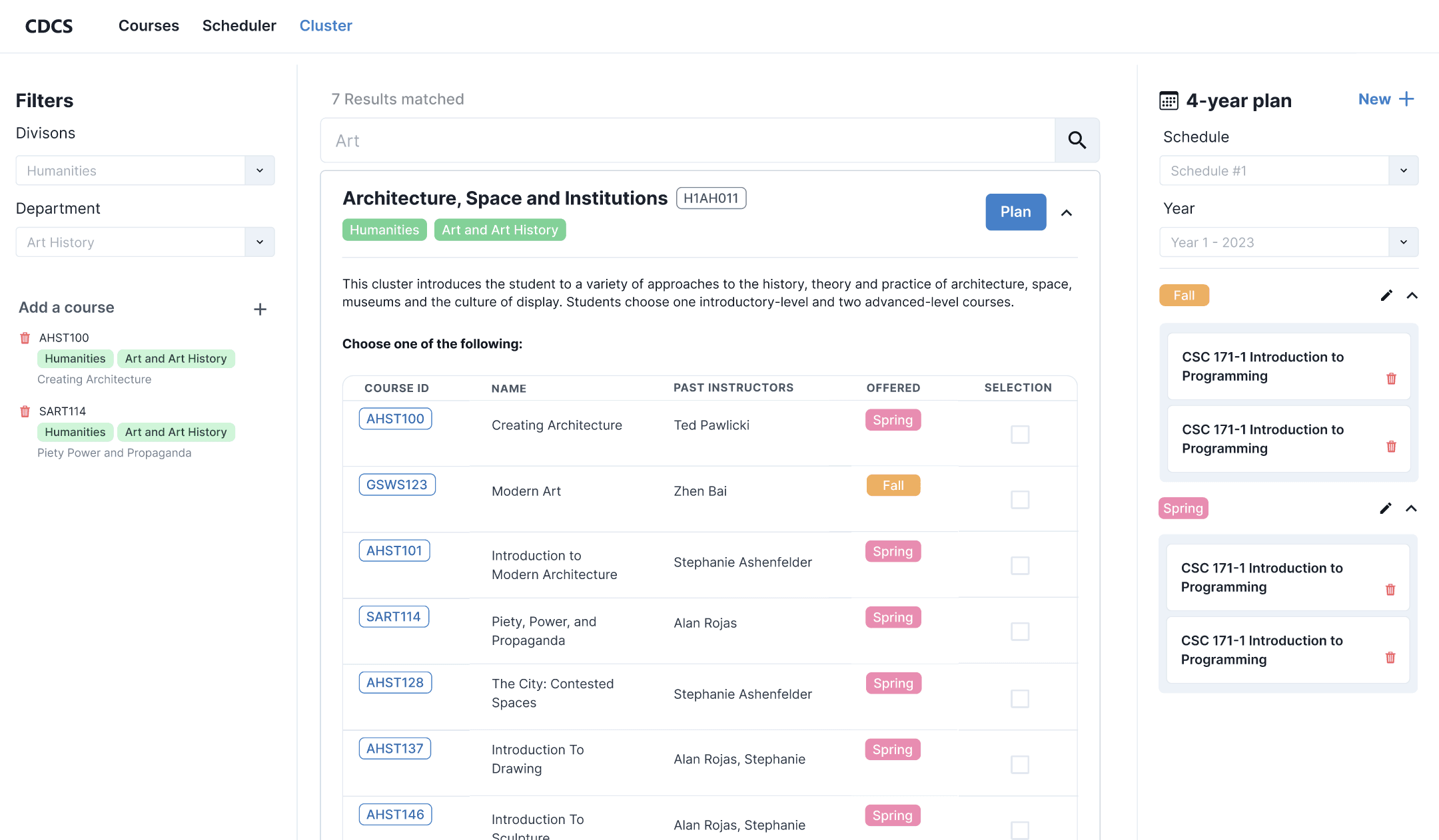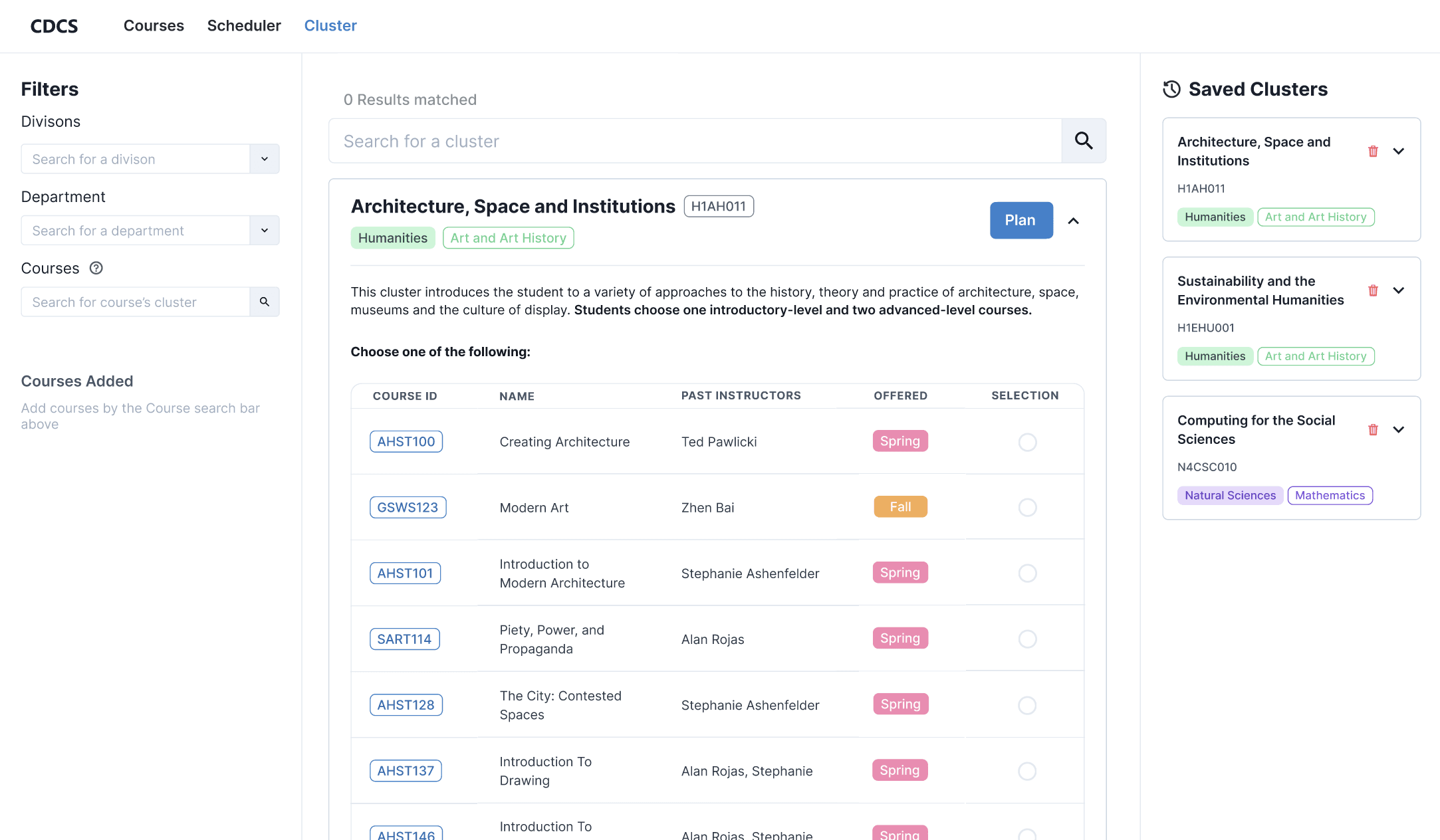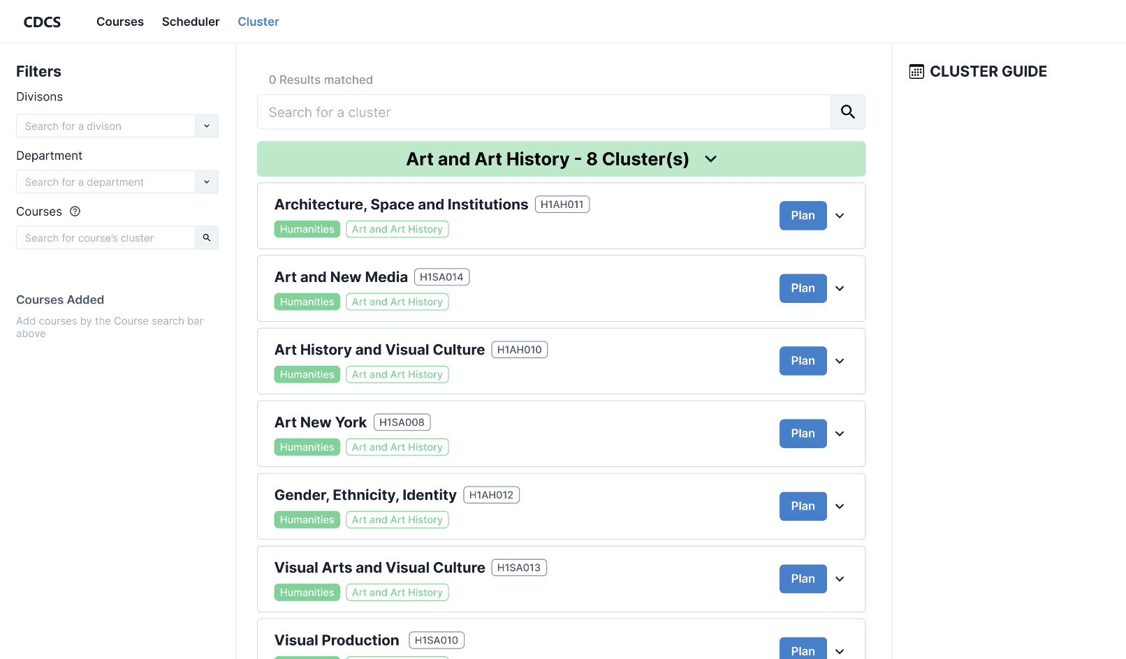 However, we realized the banner addition was redundant since we already used tags underneath a cluster's name to indicate what department it belonged to. We also filled in the cluster guide with text explaining how clusters work. The image below displays the changes we made to the previous screen. (Note: the blue "Plan" button is missing by mistake)