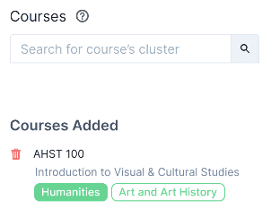 On the lefthand side, we have a feature that allows users to look up clusters that include specific courses. The way we previously had it, pictured on the left below, didn't visually fit in with the rest of the filters in its sections. We changed it to look like the Division and Department filter bars, where added courses would still populate like before.