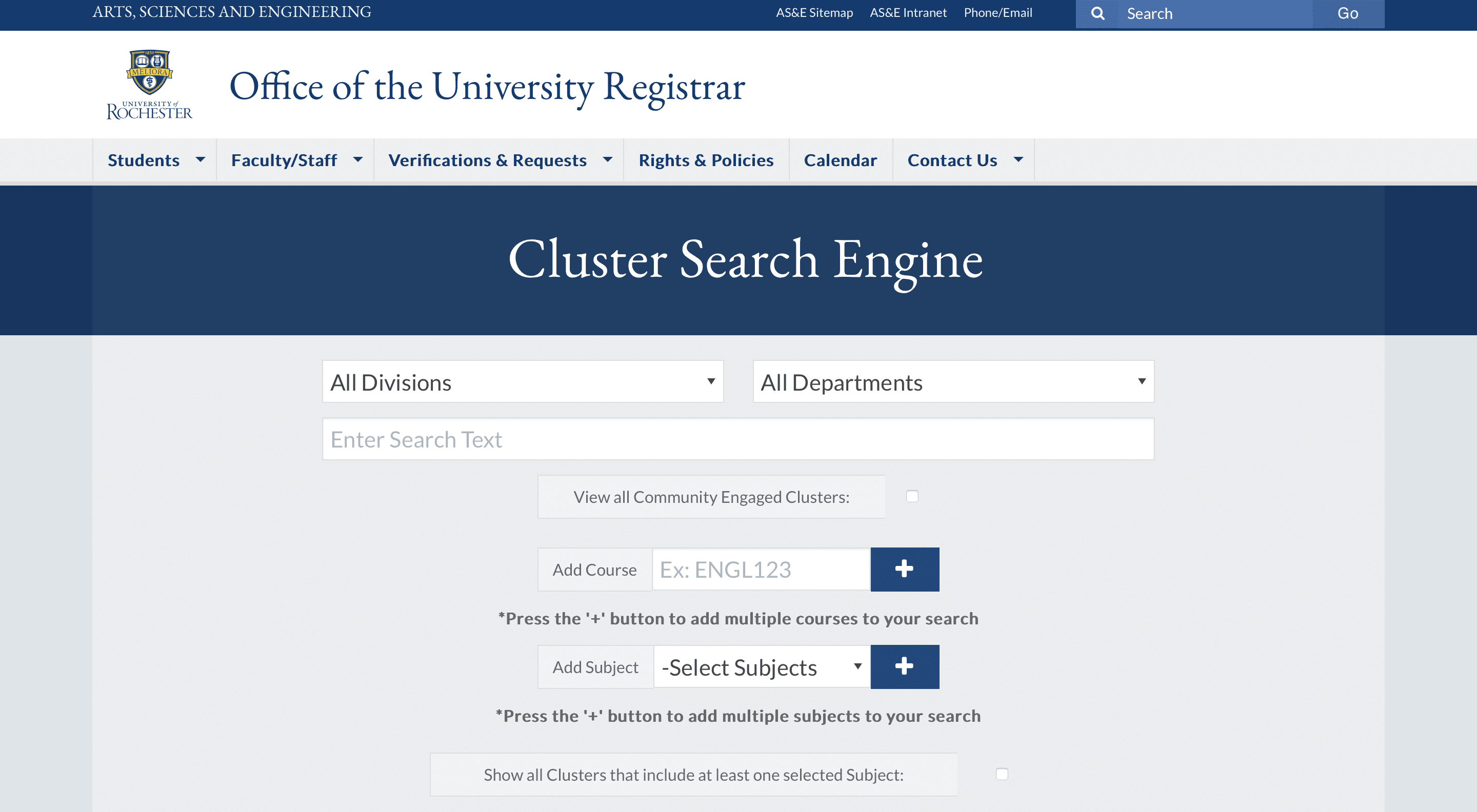 Clusters are a core part of most students' course planning at the University of Rochester, so Melcourses wanted to add the cluster search engine as a new feature. We wanted to make our version of the cluster search engine less overwhelming while staying within the existing Melcourses brand identity.